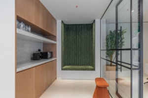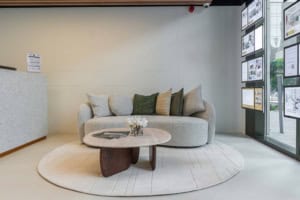 The design vision for the new office was built around the idea of a “timeless compass”, a guiding theme that reflects direction, clarity, and long‑term growth. Elementa translated this concept into a space defined by high‑end finishes, a light and airy material palette, and subtle touches of green that echo the signature haus & haus brand identity. From the exterior, the Peninsula retail units carry an industrial architectural character, and against this backdrop, the bold and clean haus & haus branding stands out, giving the office a distinguished and instantly recognizable presence.
